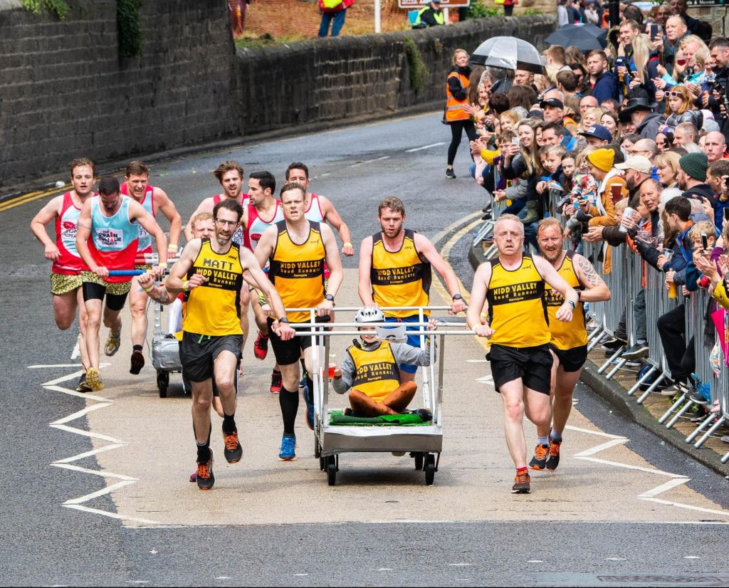 In the Knaresborough bed race, up to 90 teams of 6 competitors push a bed and rider around a punishing 2.4-mile route through the town’s steep streets before plunging into the River Nidd for a short traverse to the finish line.